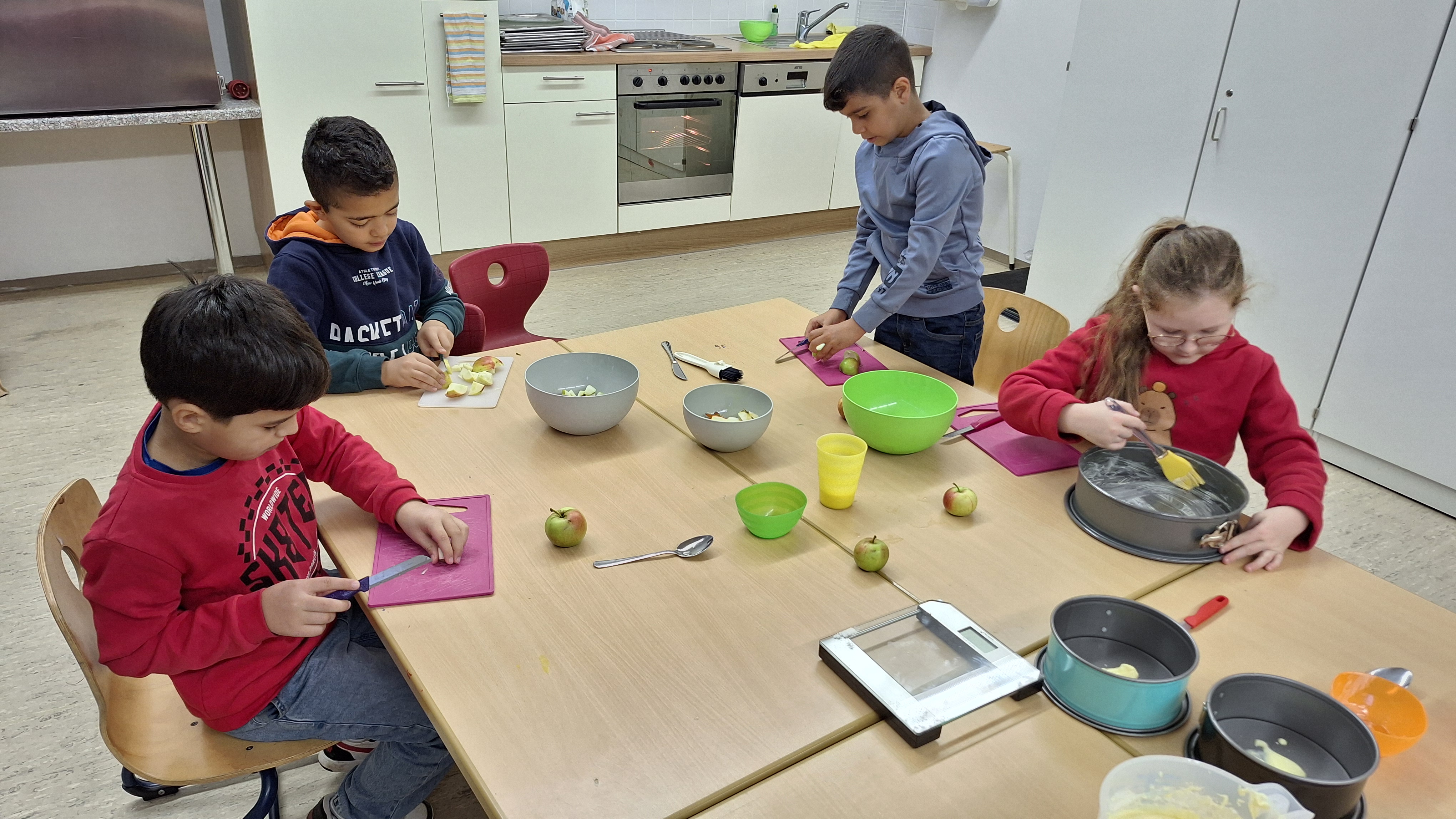 Zuerst sammelten sie hierfür Äpfel im eigenen Garten. Danach ging es in unsere Schulküche. Nach dem Besprechen des Rezeptes kamen alle Kinder in Aktion: wir wugen ab, wir rührten, wir schnitten und… Oje! - ein Ei fiel auf den Boden! Dann hieß es Aufwischen und weitermachen!