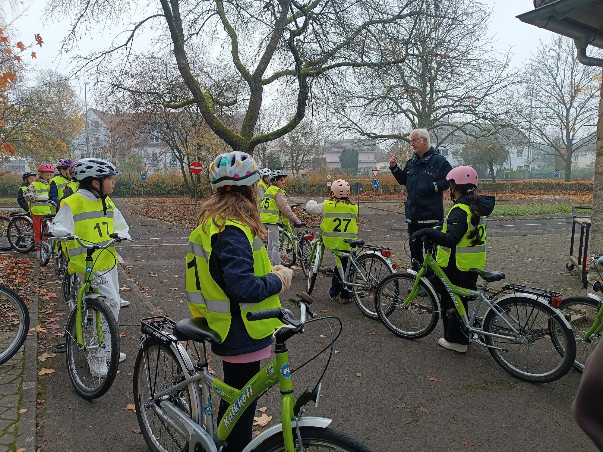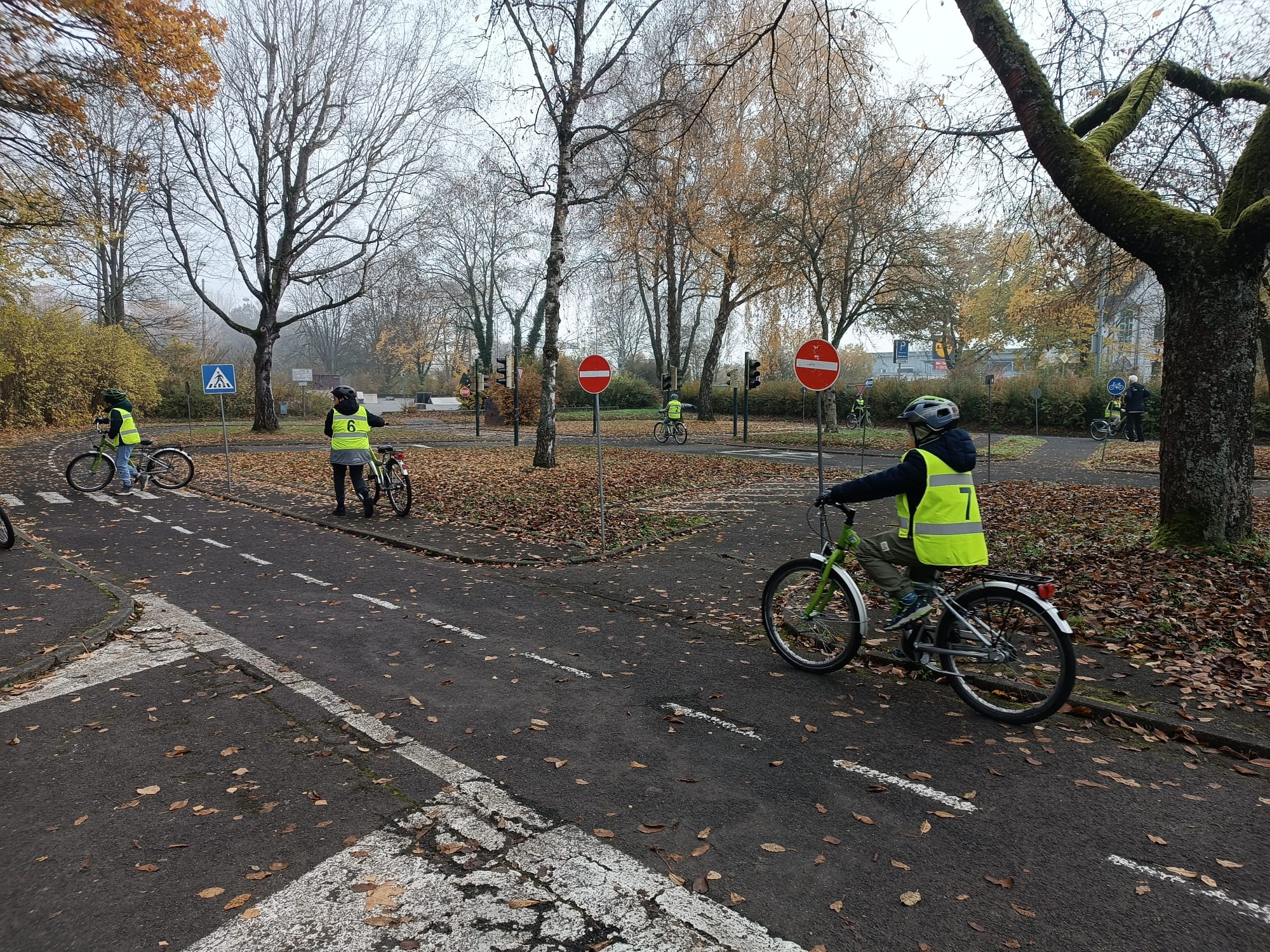 Gemeinsam mit der Polizei übten die Schülerinnen und Schüler an drei Schulvormittagen das richtige Anfahren, das Umfahren von Hindernissen, Linksabbiegen und Verhalten an Kreuzungen. Dabei stellten das herbstlich-wechselhafte Wetter und die teils laubbedeckte Fahrbahn zusätzliche Herausforderungen für die Kinder dar.